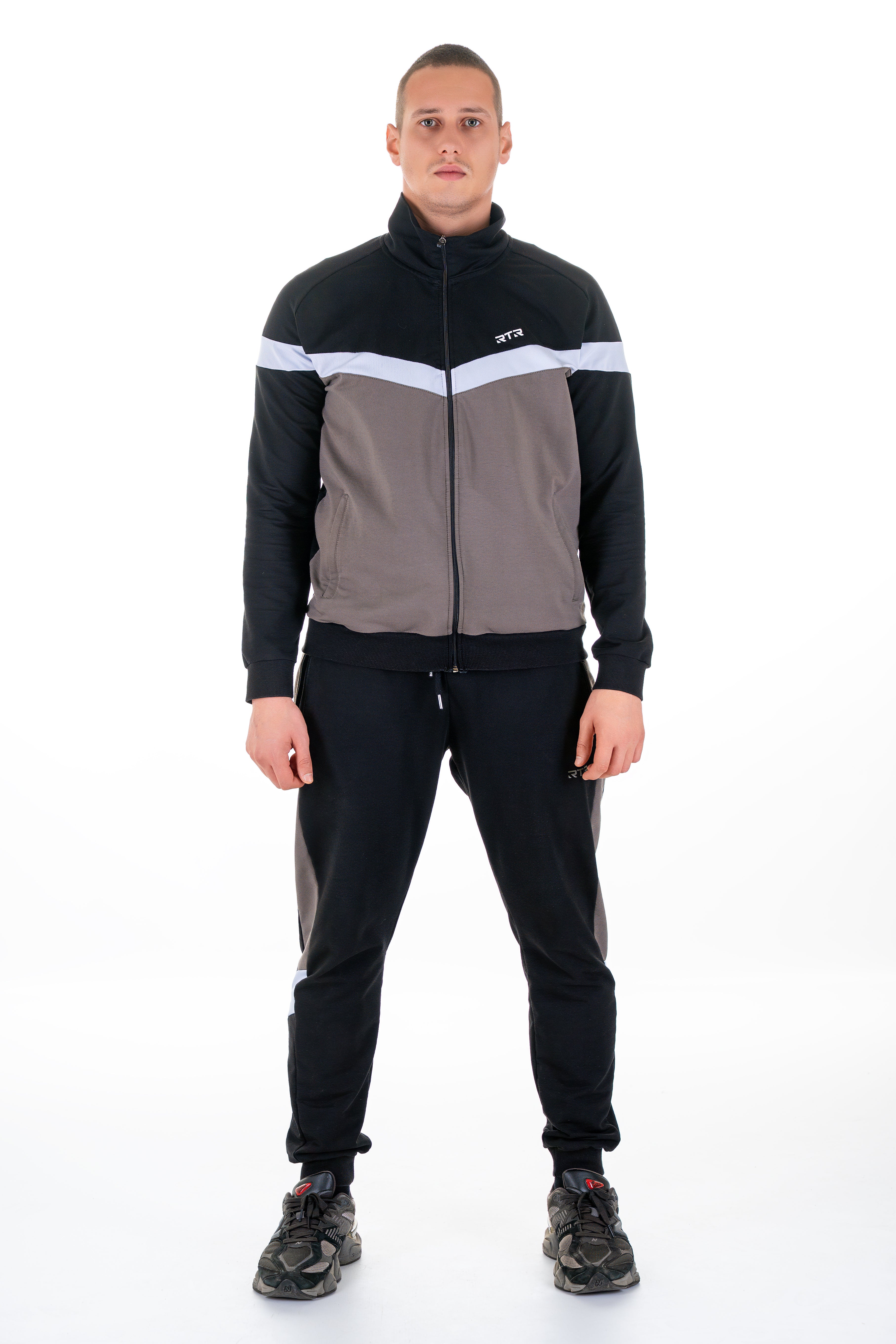Горнището е в черен цвят с контрастни каки и бели ленти на гърдите, които придават динамика и подчертават мъжествената визия.